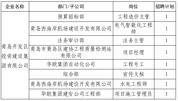 请登录“青岛人才网”(http://rc.qingdao.gov.cn),查看“青岛开发区投资建设集团有限公司”招聘公告。
